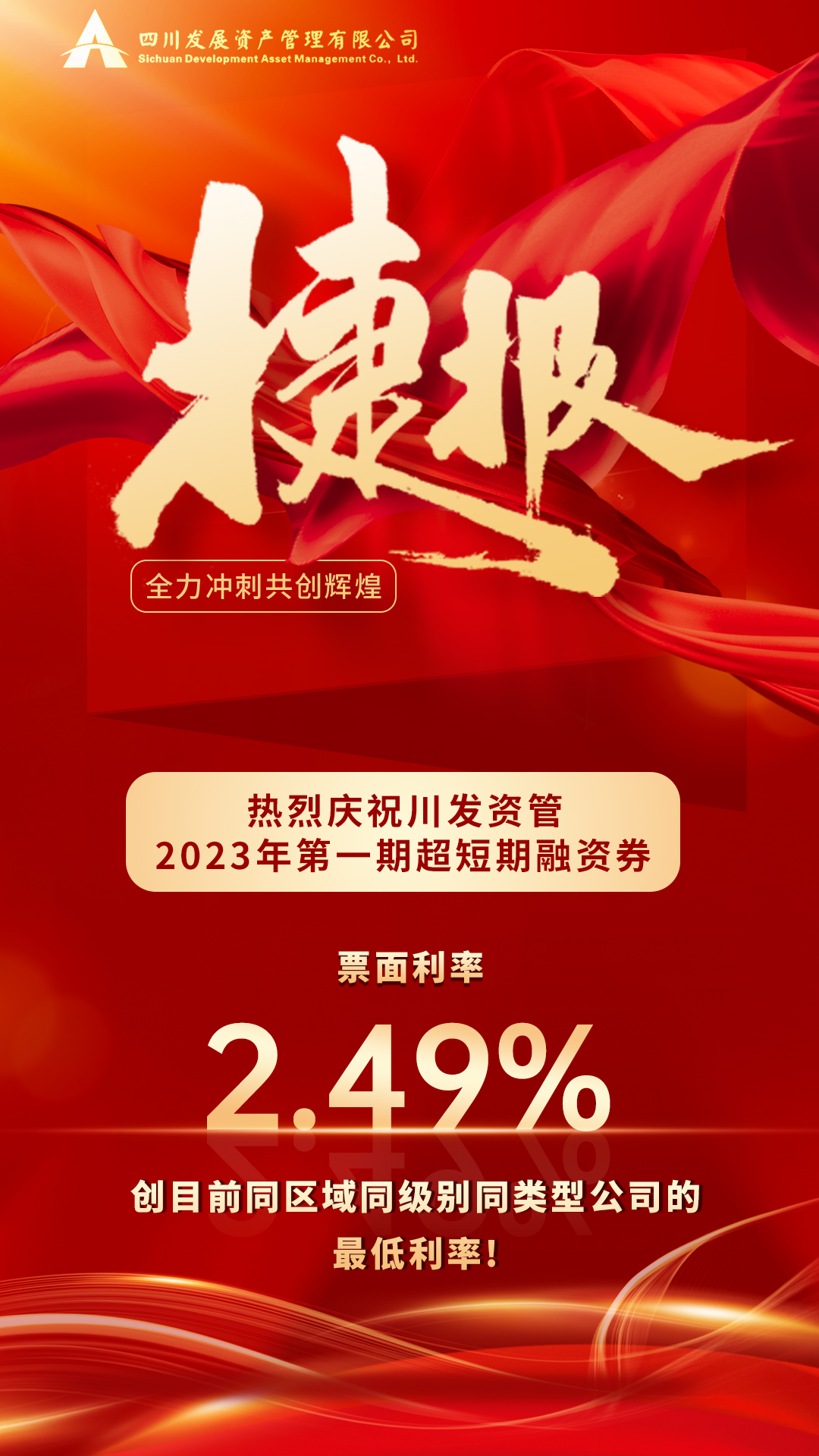 2023年7月24日,四川發(fā)展資產(chǎn)管理有限公司2023年第一期超短期融資券在北金所成功發(fā)行,發(fā)行規(guī)模3億元,期限180天,由興業(yè)銀行承銷。本期債券發(fā)行獲大量投資者關(guān)注,全場認購倍數(shù)達2倍,最終取得2.49%的票面利率,為目前同區(qū)域同級別同類型公司的最低利率。